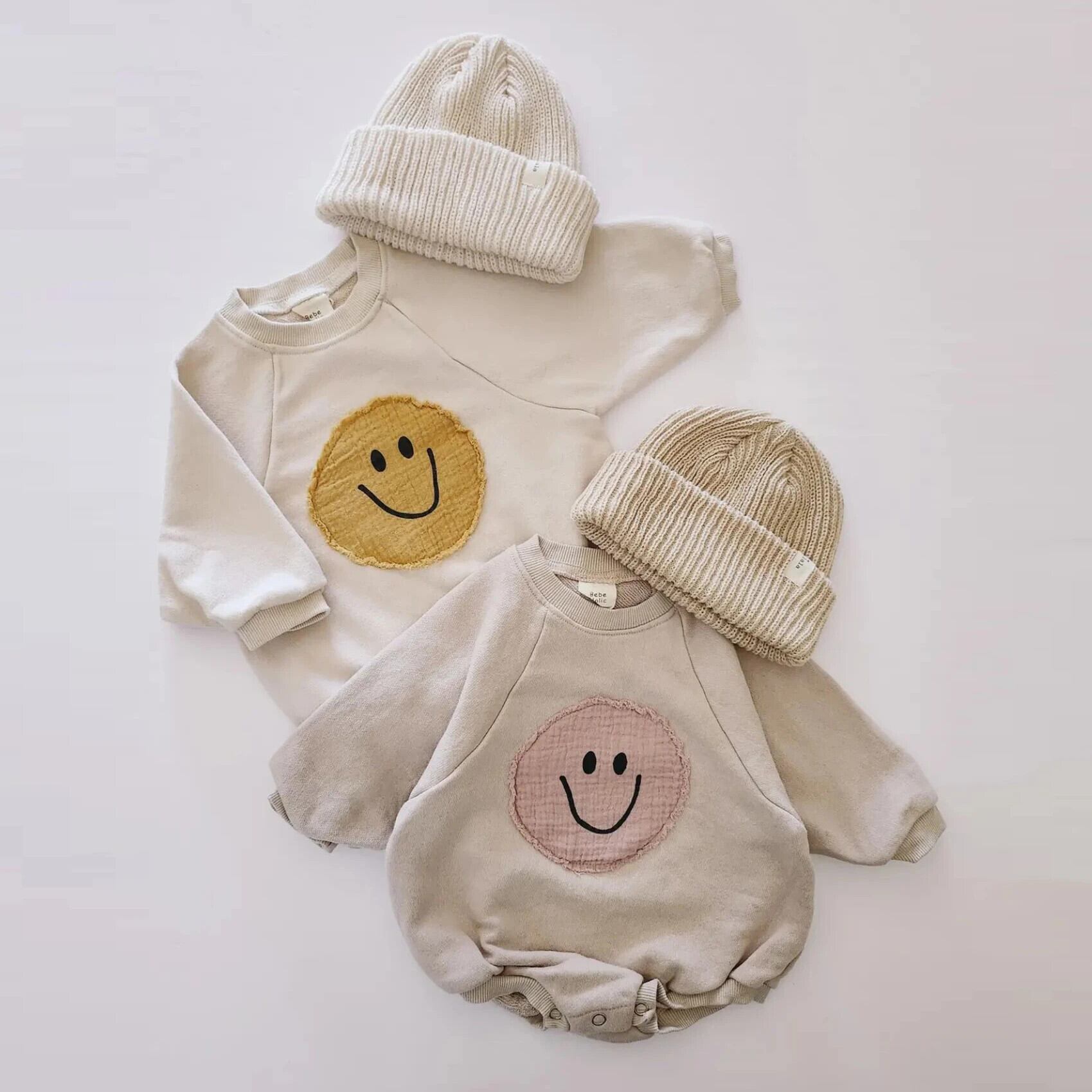 イン春ベビーボディスーツ女子スマイリーフェイストレーナーテリー綿ロンパース生まれ男子長袖幼児ジャンプスーツ ロング コットン スプリング 春物