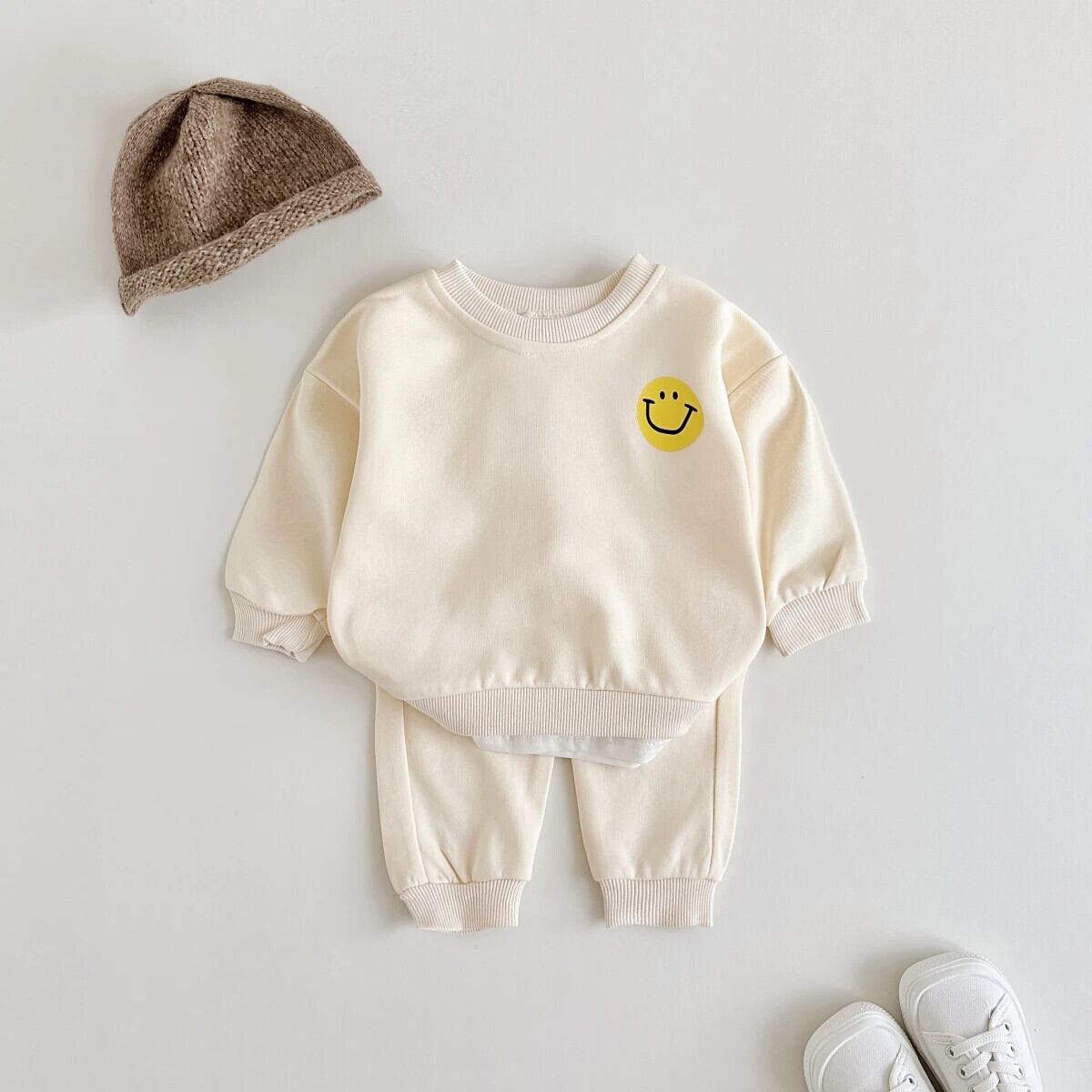 ツーピース春秋男子女子セット子供レジャースマイルプリント長袖トップ+パンツ誕生ベビーセット ロング スプリング 春物 オータム 秋物