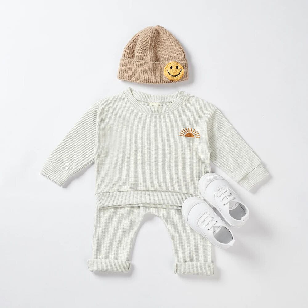 男子赤ちゃんセットソフトワッフル綿刺繍日出バッジトップス + PP パンツ生まれ幼児女赤ちゃん子供 レッド コットン キッズ