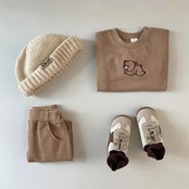 男子と女子秋ツーピースパンツセット長袖かわいい小さクマ刺繍トレーナートップとパンツ誕生セット ロング レッド 大人ガーリー スウィート キュート カジュアル オータム 秋物