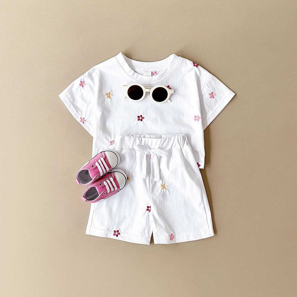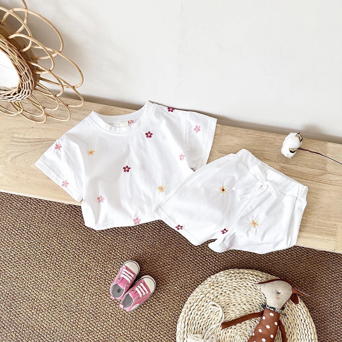2 個夏女赤ちゃんセット綿小花プリント半袖 T シャツ + ショートパンツ 0-3Y コットン ハーフスリーブ サマー 夏物 Tシャツ フラワーデザイン