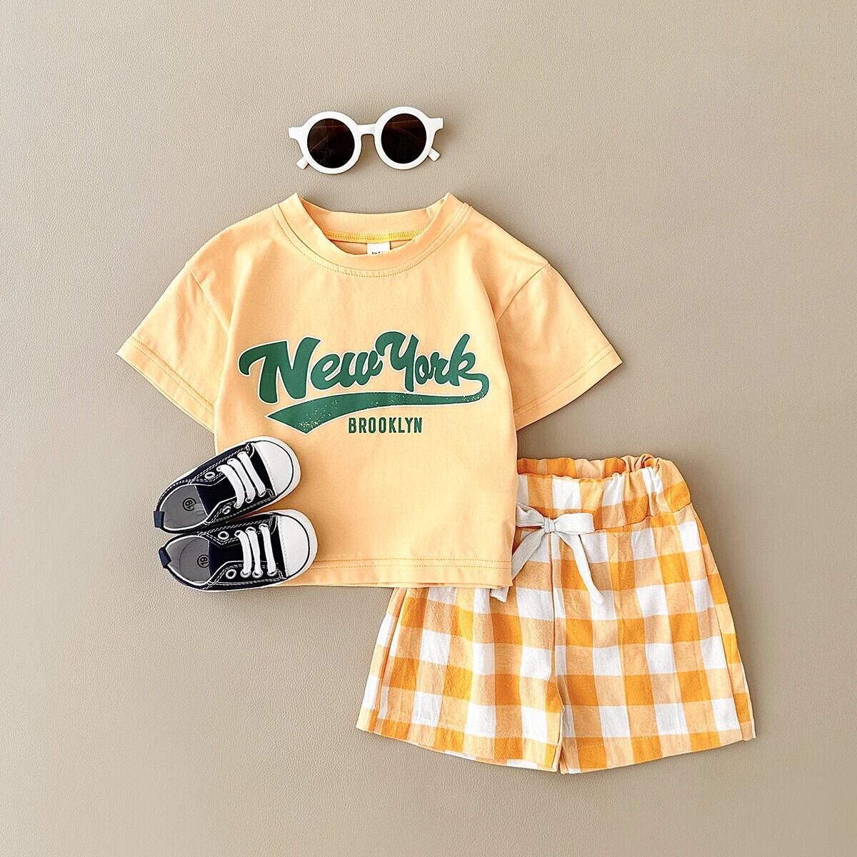 生まれ男子ベビーセット 2 個レタープリント半袖 T シャツ + チェックパンツ女子幼児 0-3Y ショート レッド ハーフスリーブ ショーツ ブルマー Tシャツ