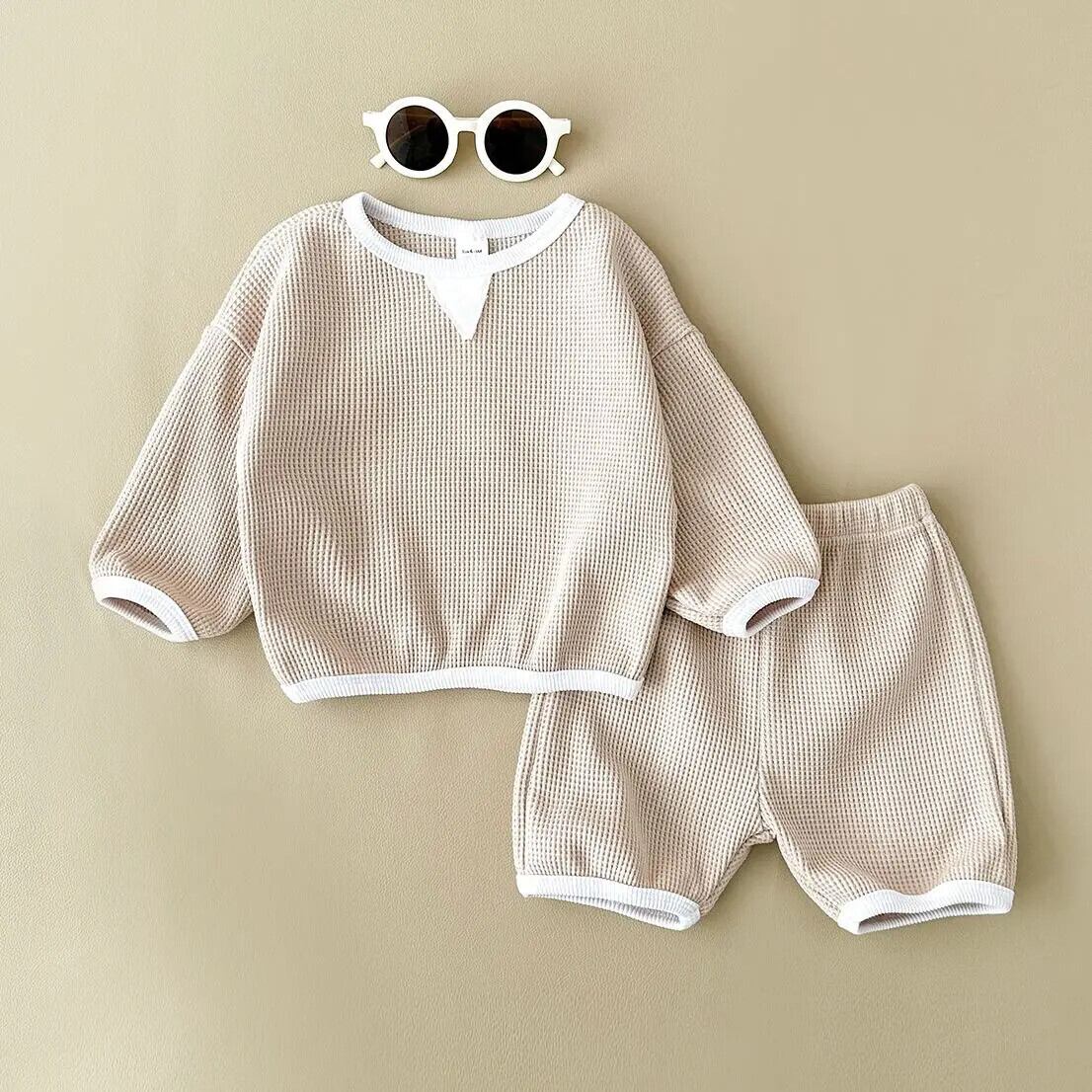 春/夏生まれ赤ちゃん男子女子ベビーセット無地ワッフル長袖シャツ+ショーツ幼児ベビー ロング スプリング 春物 サマー 夏物 ブルマー ソリッドカラー