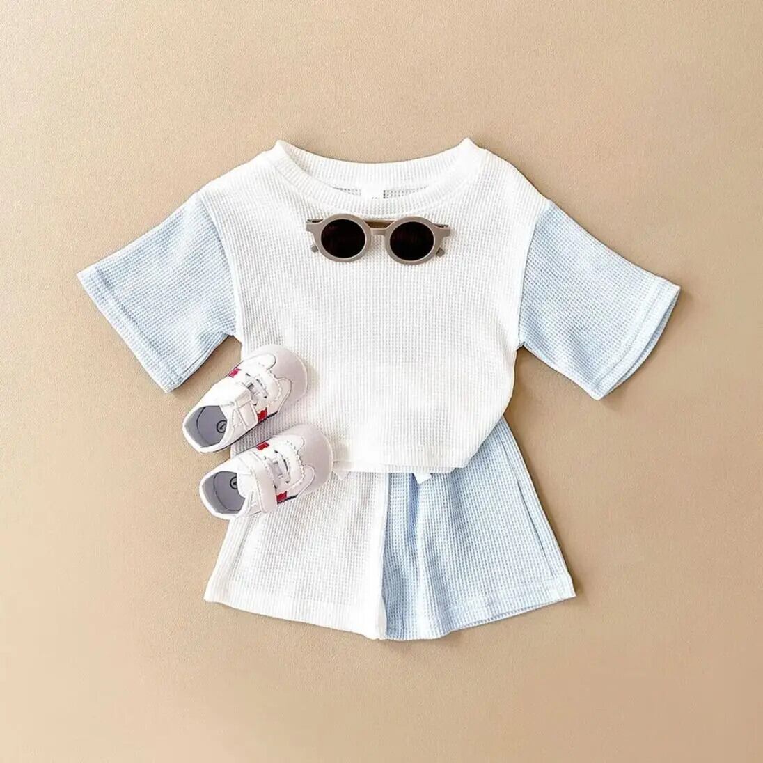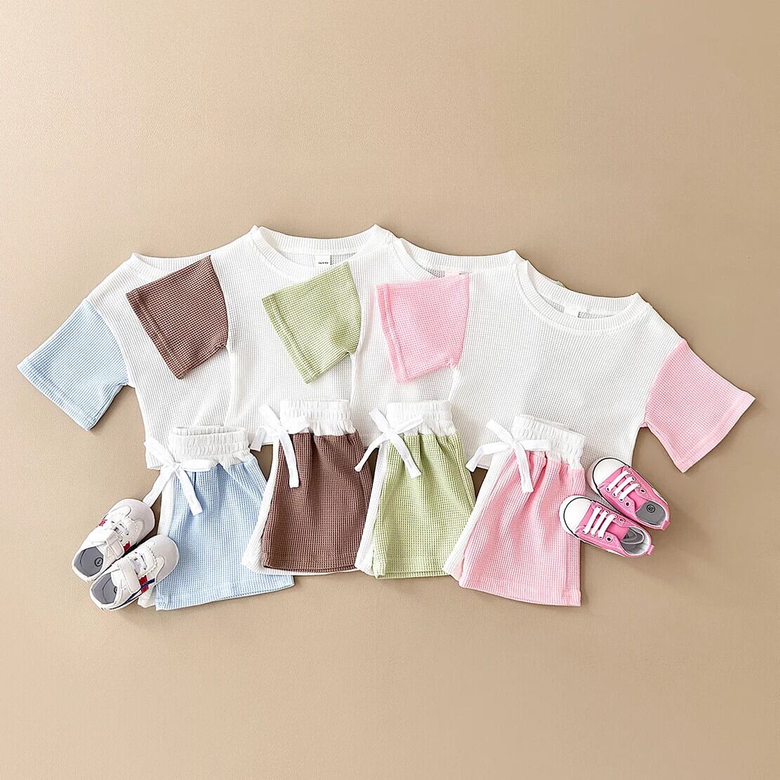 夏生まれベビー 2 個男子女子幼児セット 0-3Y カラーワッフル Tシャツ + ショーツ綿子供 0-3Y コットン サマー 夏物 ブルマー