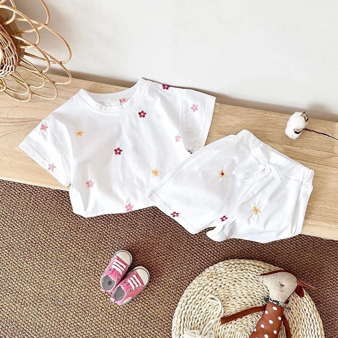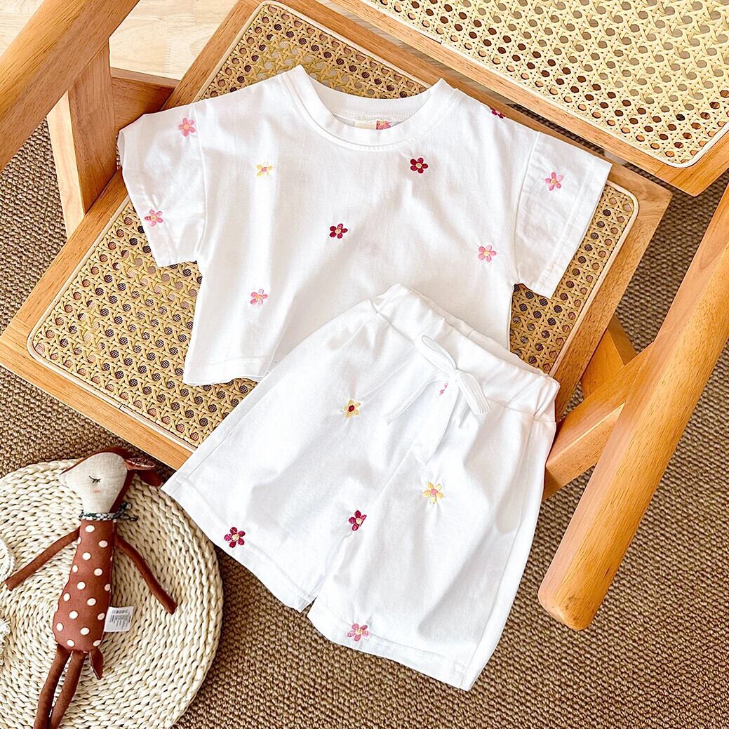 2024 生まれベビー 2 個夏女赤ちゃん綿小花プリント半袖 T シャツ + ショーツ 0-3Y 幼児セット ショート コットン ハーフスリーブ サマー 夏物 ブルマー Tシャツ フラワーデザイン